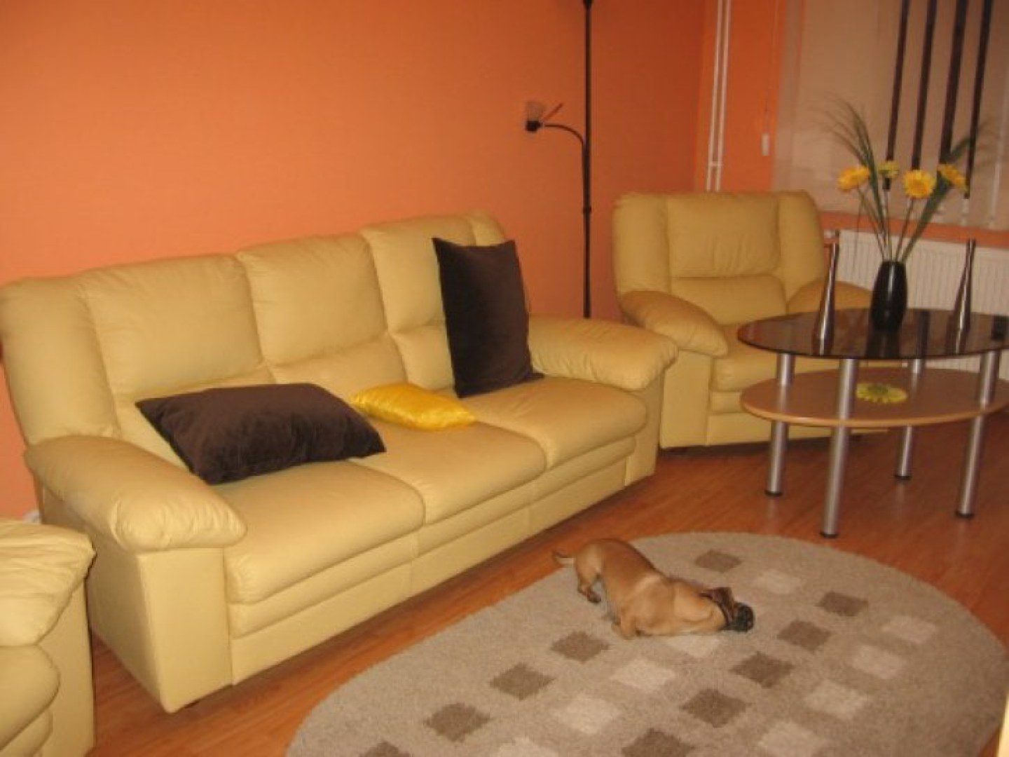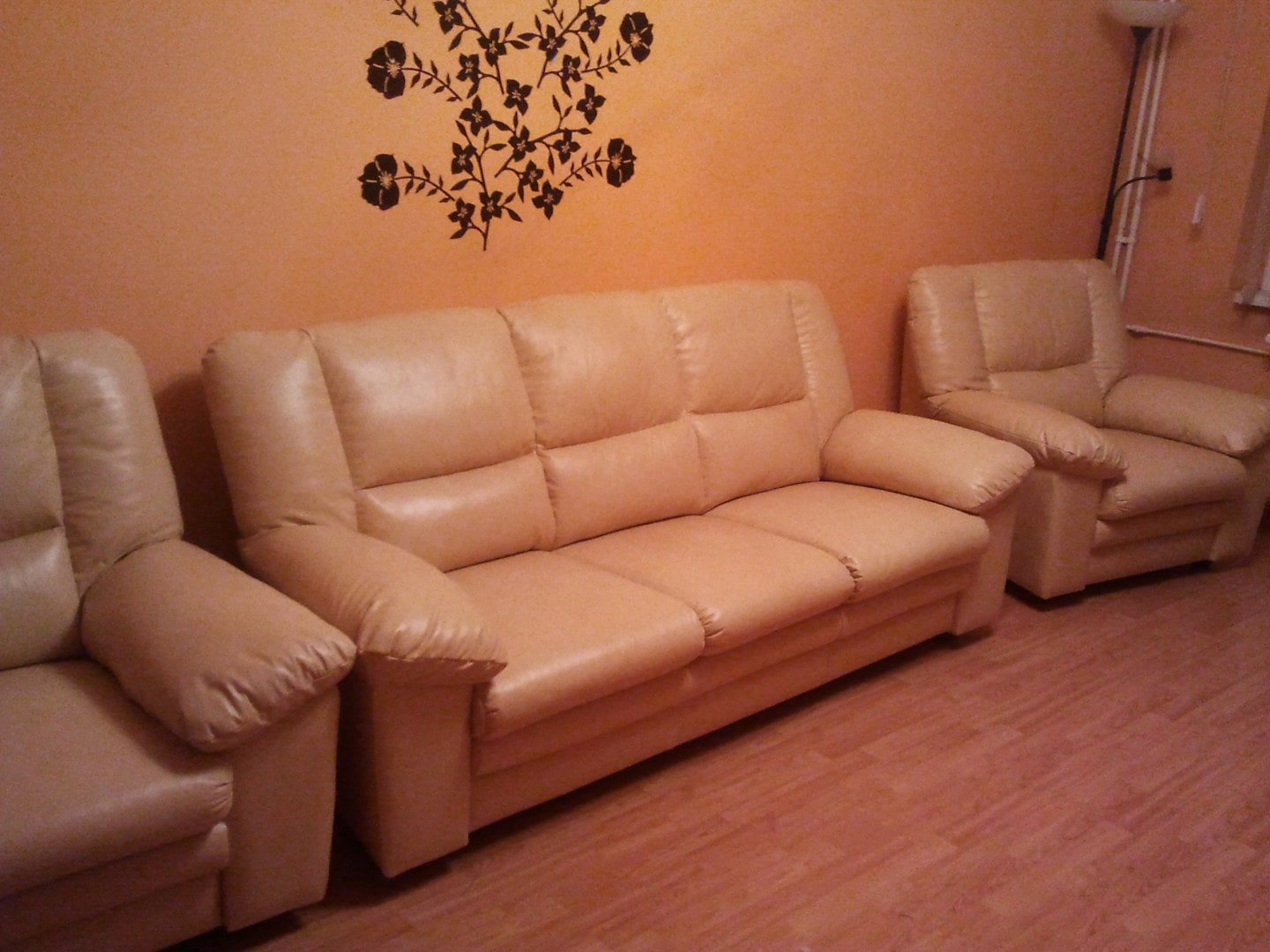 Canapeaua si fotoliile se prezentau in stare buna, singura problema fiind tapiteria din piele galbena care se uzase in mai multe locuri.