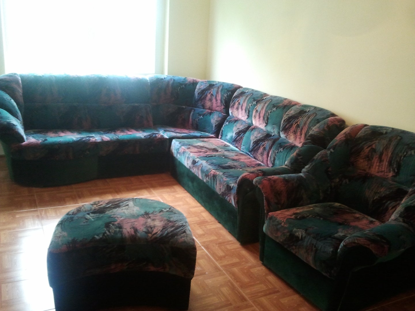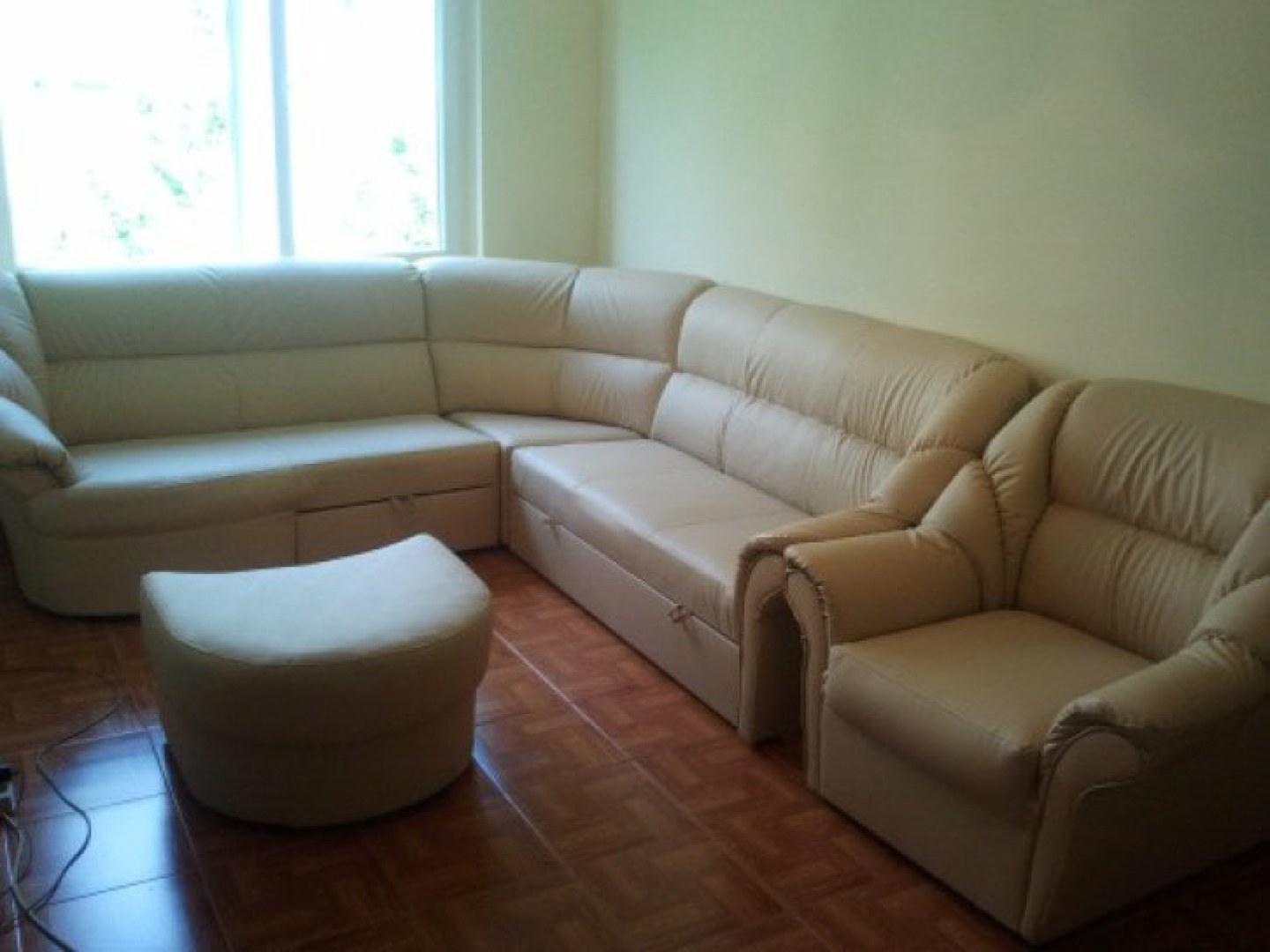 Un set format din canapea de colt, un fotoliu separat si un taburet a fost retapitat in totalitate, operatie destul de dificila datorita modelului.