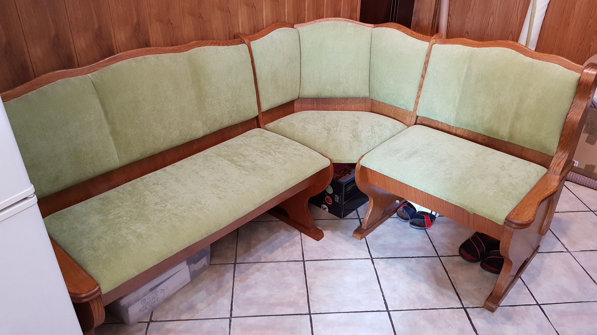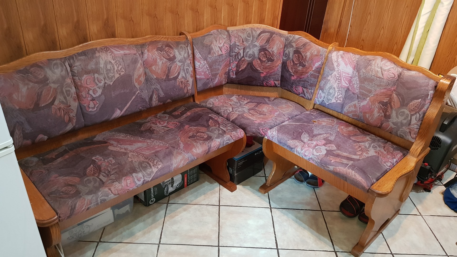 Stofa originala s-a mentinut in conditii bune dar nu a mai fost pe placul clientei. Aceasta s-a hotarat sa dea o pata de culoare bucatariei prin retapitarea coltarului cu alt material.