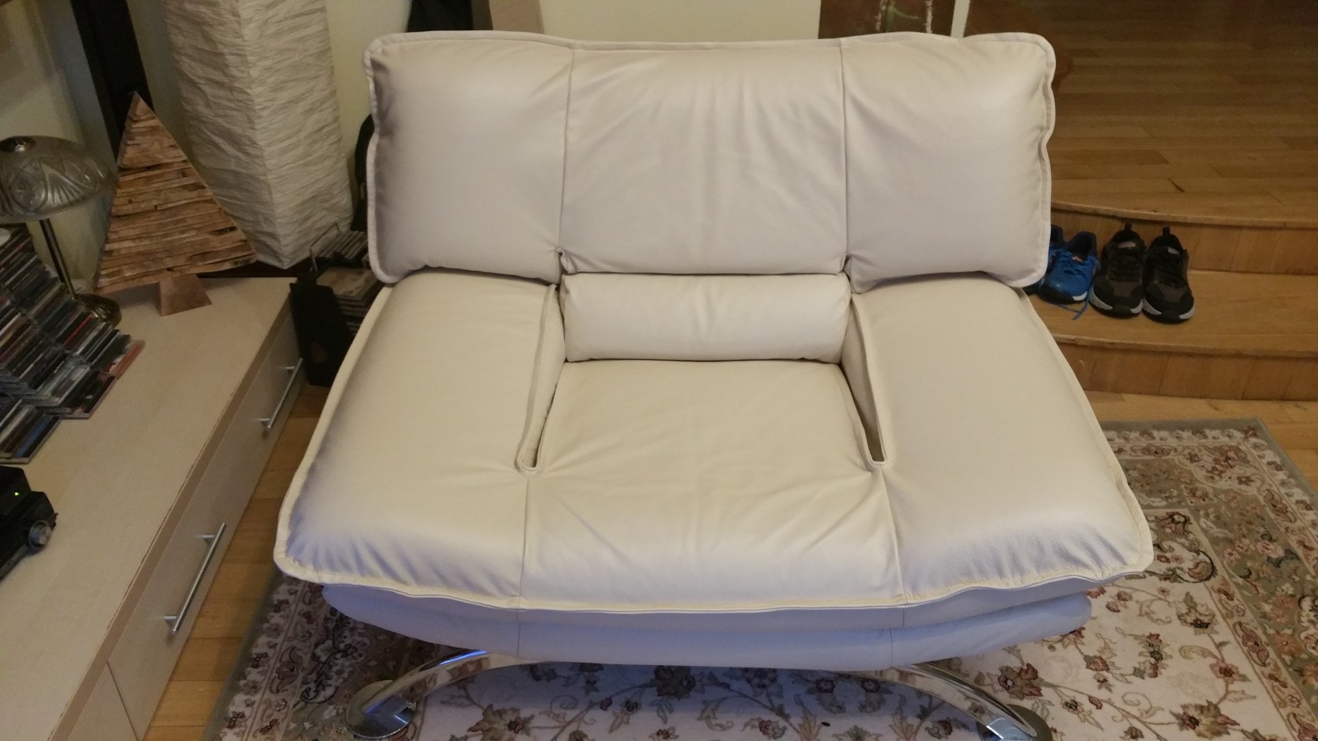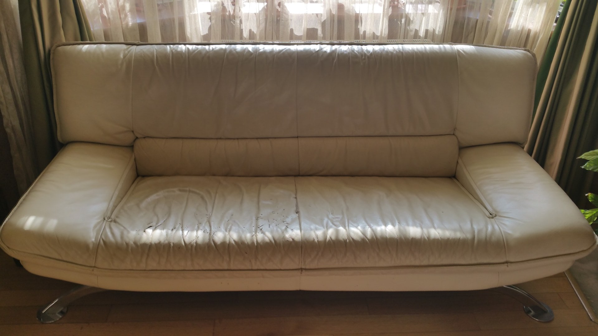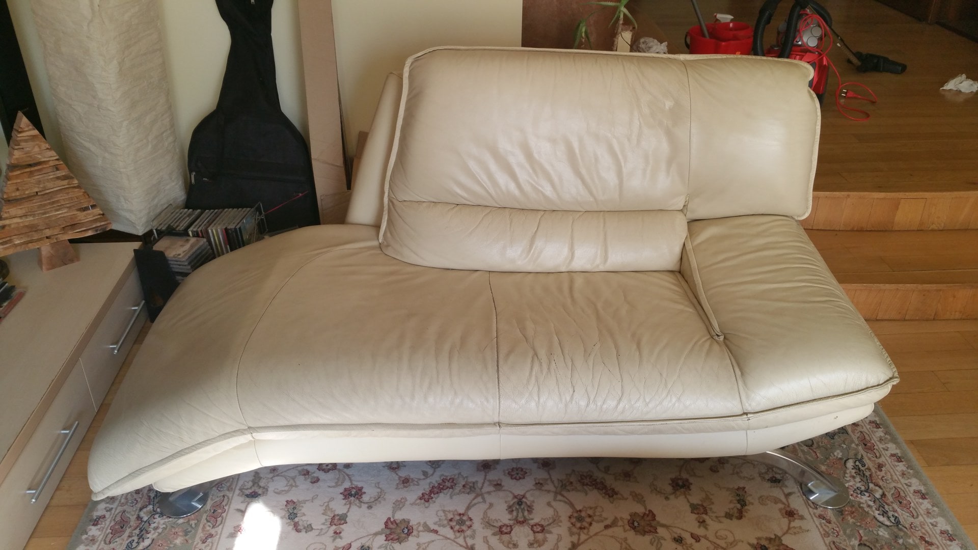 Canapeaua de trei locuri, sezlongul si fotoliul faceau parte dintr-un set cumparat cu ceva timp in urma iar folosinta indelungata si-a spus cuvantul. Pielea a inceput sa se toceasca si in cele din urma a cedat in mai multe locuri.